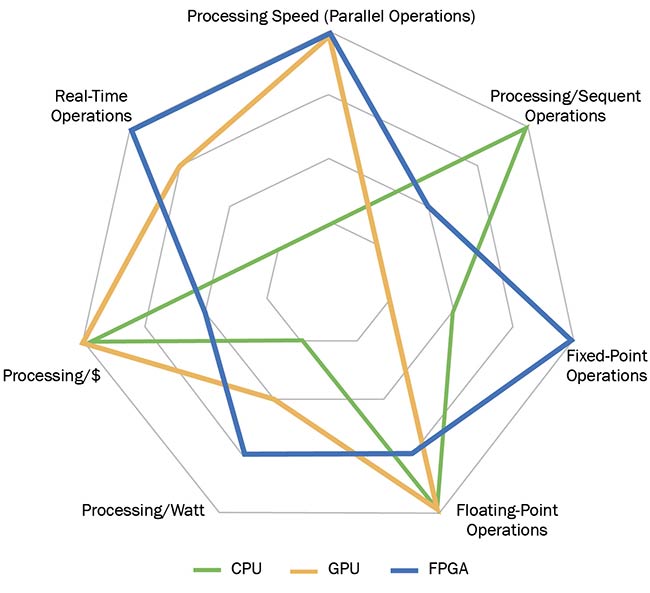 At the highest levels of processing, FPGAs provide the greatest advantages in speed and flexibility. Given their highly efficient parallel-processing capability, FPGAs are more suitable than CPUs or GPUs for real-time processing and multiple-interface applications. They are reprogrammable, with flexibility for design changes and new functionality that cannot be achieved with any other architecture (Figure 2).