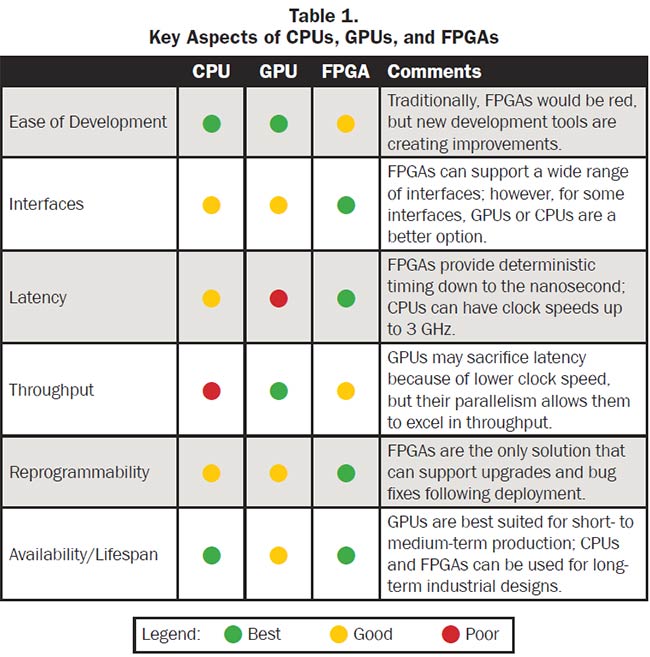 CPUs are easy to program and compile, and they offer versatility in that they can execute a wide range of functionality. Typically, they also include a host of analog and digital peripherals. CPUs perform processing operations in sequence. For vision applications, one operation must run on an entire image before the next operation can begin. Multicore CPUs allow for some level of parallel operation (albeit far less than GPUs or FPGAs), increasing performance but not affecting programmer friendliness.