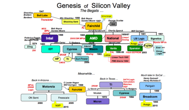 …eventually known as “Fairchildren,” directly or indirectly creating dozens of corporations, including Intel and AMD. In doing so, Fairchild sowed the seeds of innovation across multiple companies in the region that would eventually become known as Silicon Valley. (Source: EE Times – Roots of Silicon Valley, Part 3)
