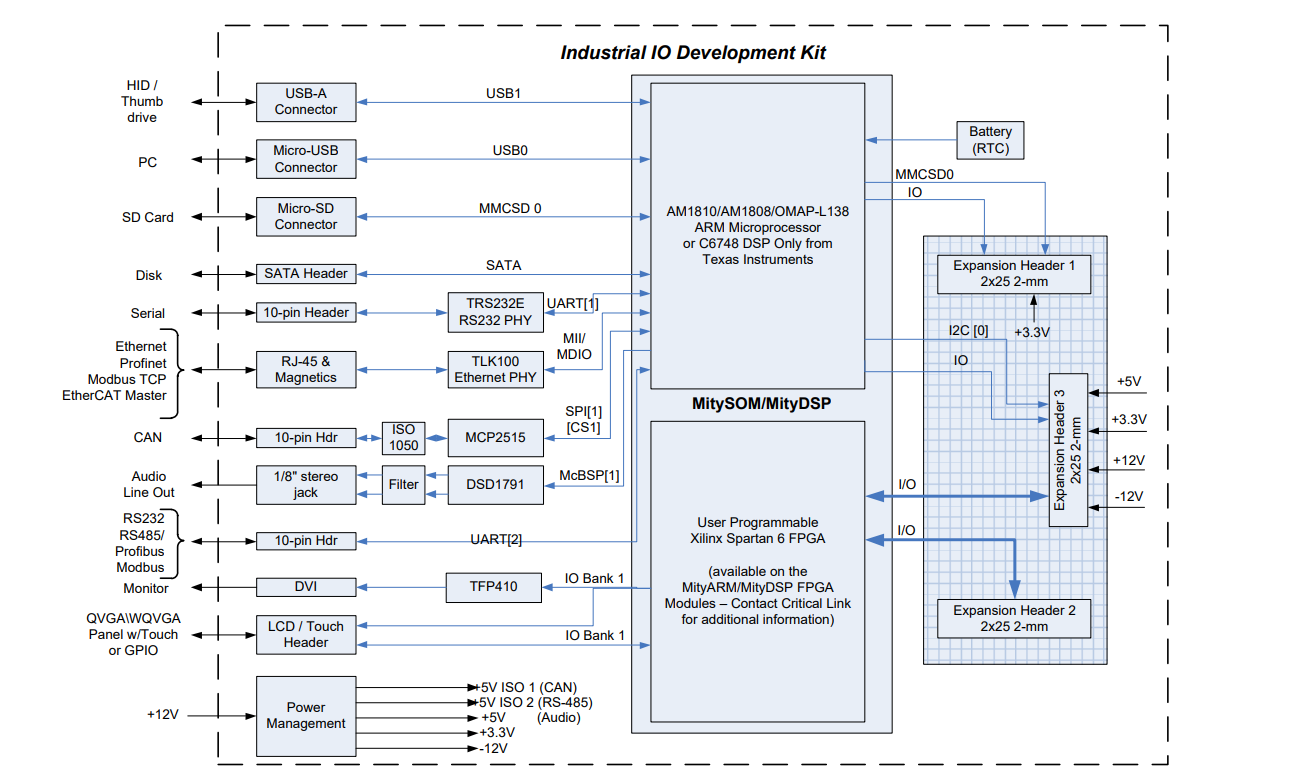The MityDSP-L138(F) Industrial IO Development Kit supports the OMAPL138-based modules from Critical Link.