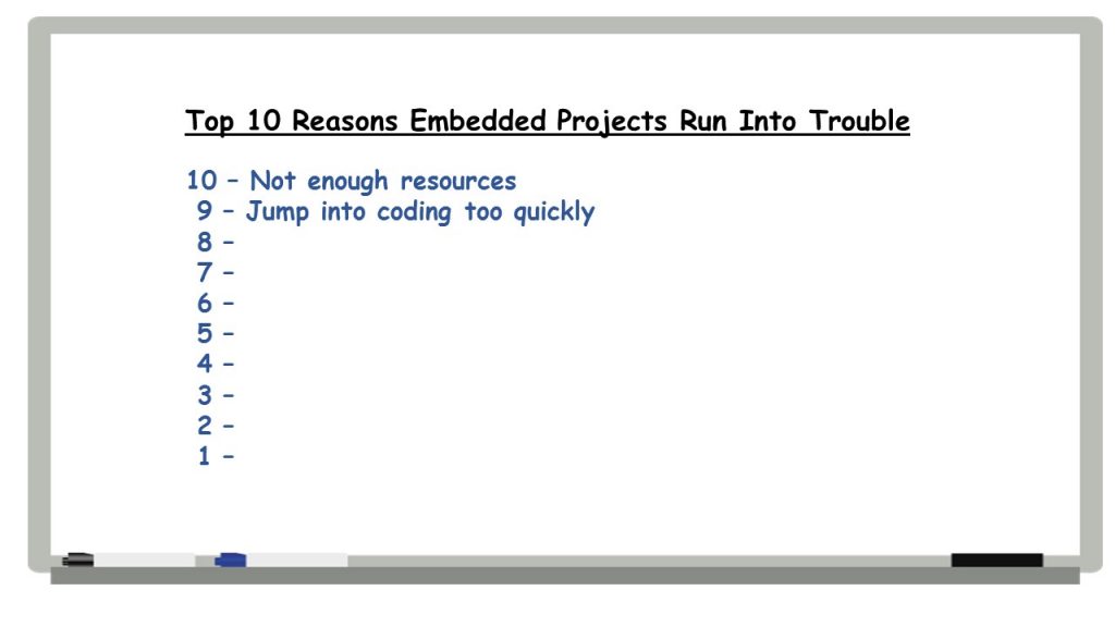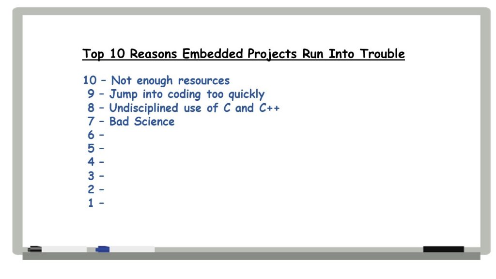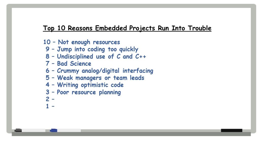 Anyway, that’s it for the Top Ten Reasons Embedded Projects Run into Trouble. Good things to keep in mind, even for us old-timers! Hope that you enjoyed reading this series of post as much as I enjoyed writing them. I think the list is pretty complete, but if you have other problem areas you think should have made the list, please let me know. I’d love to hear from you.