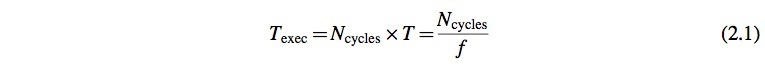 In terms of raw performance metrics, the execution time of an application or task, designated as Texec, is computed as the number of clock cycles the hardware (e.g., the CPU) takes to complete it, multiplied by the period of the operating clock (or divided by the clock frequency).