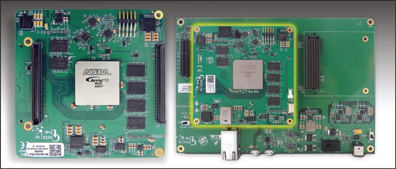 One example of such a SOM is Critical Link’s MitySOM-A10S, an Intel/Altera Arria 10-based board that features up to 480KLE FPGA fabric, onboard power supplies, two DDR4 RAM memory subsystems, a micro SD card, optional eMMC, on-board RTC, a USB 2.0 port, and temperature sensors (Figure 1). With an Arria 10 SX processor that features dual-core Cortex-A9 32-bit RISC processors with dual NEON SIMD coprocessors, the multiprocessing unit (MPU) is capable of running any number of commercial operating systems, bare metal, and embedded Linux.