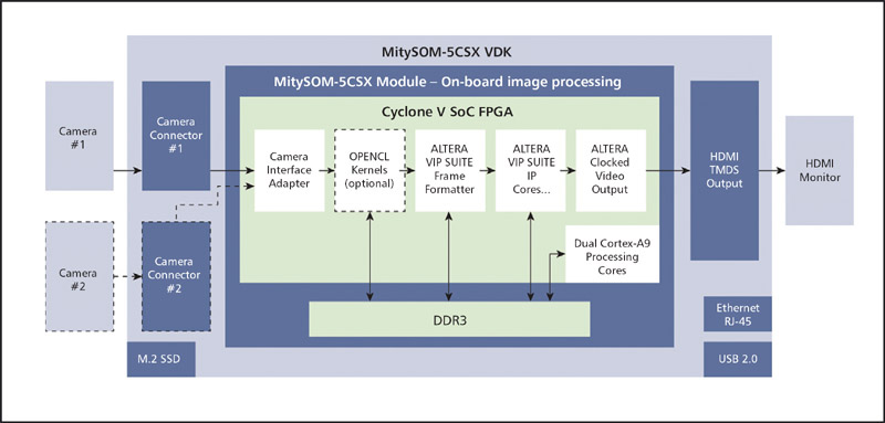 Development kits give hardware designers the option to use manufacturer-provided schematics and design files as a starting point to test out the validity of their designs before committing to their custom interface board. As hardware engineers develop the necessary interfaces, software engineers can choose from numerous commercial and open source image processing libraries to develop the final product. One such library is the Video Image Processing (VIP) suite from Intel, a library of FPGA intellectual property (IP) that includes such functions as color space conversion, up/down image scaling, frame rate conversion, image convolution, video I/O formatting, and thresholding.