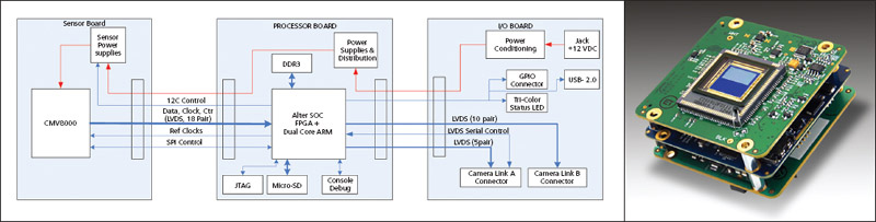 This modular concept of sensor board, processor board, and interface board is taken a step further with Critical Link’s MityCAM architecture. Figure 4 shows a block diagram of a three-board system where each board allows for a certain level of interchangeability depending on the requirements of the system. CMOS and CCD sensor boards are available with an array of image sensors from top manufacturers, and new sensors can be integrated quickly and cost effectively.