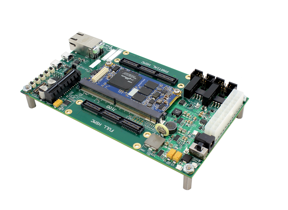The MitySOM-A10S Image Processing Board is an open architecture design featuring dual core Cortex-A9 ARMs with up to 480KLE user-programmable FPGA fabric, DDR4 memory, and 12 high-speed transceiver pairs. It is an ideal solution for machine vision and scientific imaging applications. Both the MityCAM-C50000 and MitySOM-A10S support OpenCL™ and high-level synthesis (HLS) tools for accelerating design cycles and targeting C/C++ code to the FPGA, and provide unparalleled ease of customization for complex imaging platforms.