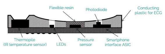 thermopile measures heat radiation to estimate body temperature. The application-specific integrated circuit designed by LMD controls the LEDs; captures and digitizes data from the photodiode, pressure sensor, and thermopile; and communicates with the mobile phone processor. (Source: article by Maurizio di Paolo Emilio on embedded.com)