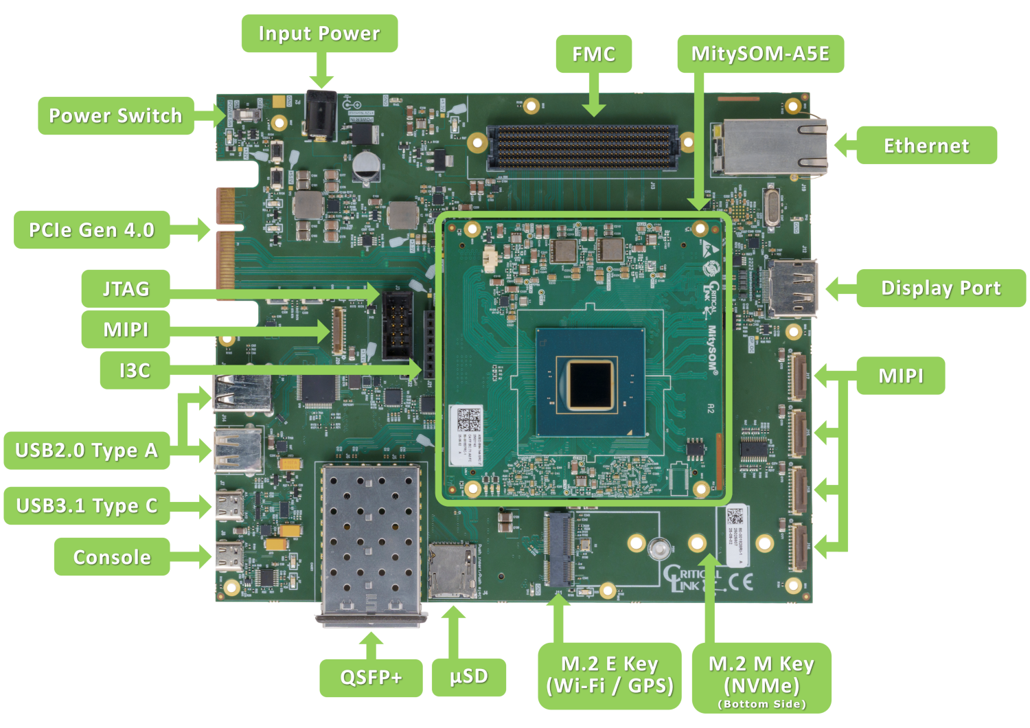 Each Development Kit comes complete with all the connectivity needed in any application well suited for the MitySOM-A5E, including DisplayPort, USB 3.1 Gen 1, Gigabit Ethernet, two SFP+ (supporting up to 10 Gb Ethernet), four x4 lane MIPI CSI camera inputs, and PCIe 4.0. Additionally, the development kit is equipped with a USB-C console interface, Micro-SD card storage, and a LPC FMC expansion interface providing support for additional I/O signals and up to 8 transceiver pairs.