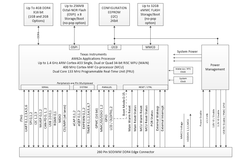 The onboard AM62x processor provides up to a Quad Core Cortex-A53 64-bit RISC processor with a NEON SIMD coprocessor. This microprocessor unit (MPU) can run a rich set of real-time operating systems containing software applications programming interfaces (APIs) expected by modern system designers. The ARM architecture supports several operating systems, including Linux and Android.